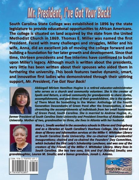 South Carolina State College was established in 1896 by the state legislature to provide educational opportunities to African Americans. The college is situated on land acquired by the state from the United Methodist Church in 1869. Thomas E. Miller was named the first President. Faced with many challenges and struggles, Miller and his wife, Anna, did an excellent job of moving the college forward and building a foundation for her later growth and development. Since that time, thirteen presidents and five interims have continued to build upon Miller's legacy. Although much is written about the presidents, very little has been written about their spouses who aided them in furthering the university. This book features twelve dynamic, smart, and innovative first ladies who demonstrated through their untiring support, Mr. President, I've Got Your Back!