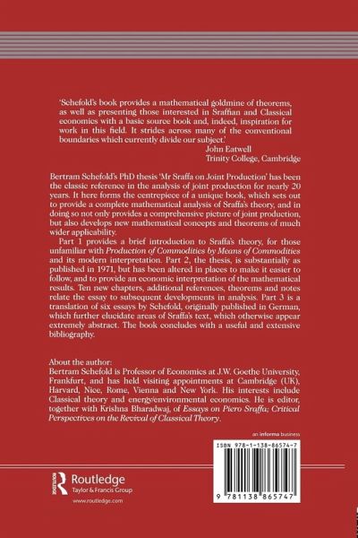 Preface Part I Introduction 1 Sraffa's First Critique 2 Ricardo and the Surplus Approach 3 Single-Product Sraffa Systems: Labour Values 4 Single-Product Sraffa Systems: Prices 5 Single-Product Sraffa Systems: Movement of Relative Prices 6 Single-Product Sraffa Systems: Basics and Non-Basics 7 Single-Product Sraffa Systems: The Standard Commodity 8 Single-Product Sraffa Systems: Reswitching 9 Theory and History 10 The Problem of Value with Joint Production in a Classical Perspective 11 The Fundamental Principle of the Determination of Prices with Joint Production 12 The Main Questions to be Answered and the Limits of the Answers Given in this Book 13 Summary of Results 14 Notation and how to Get Started with Joint Production Part II Mr Sraffa on Joint Production A General Joint Production Systems 1 The System 2 The Concept of a Basic System 3 The Uniqueness of the Basic System 4 Labour Values 5 Distribution and the Standard Commodity 6 Expansions of the Price Vector 7 Peculiarities of Joint-Production Systems: Existence of the Standard Commodity 8 All-productive and Related Systems 9 The Standard Commodity and the Possibility of Balanced Growth 10 Graphic Techniques Method 11 Applications 12 Definition of a Pure Fixed-Capital System 13 The Centre of Fixed-Capital Systems 14 Price Movements of Finished Goods15 The Value of Machines 16 Efficiency and Age of Machines 17 Perennial and Obsolete Machines in Long-Period and Short-Period Analysis 18 Fixed Capital, Switching of Techniques and the von Neumann Model 19 'Extensive' and 'Intensive' Diminishing Returns 20 Effects of the Presence of Land on the Basic System Part III Other Essays: 1 Production Costs in Neoclassical Theory 2 Ricardo 3 Critique of Neoclassical Theory 4 Sraffa and Marx 5 Distribution, Prices and Competition 6 Some Thoughts on the Foundation of Value in Sraffa and his Standard Commodity