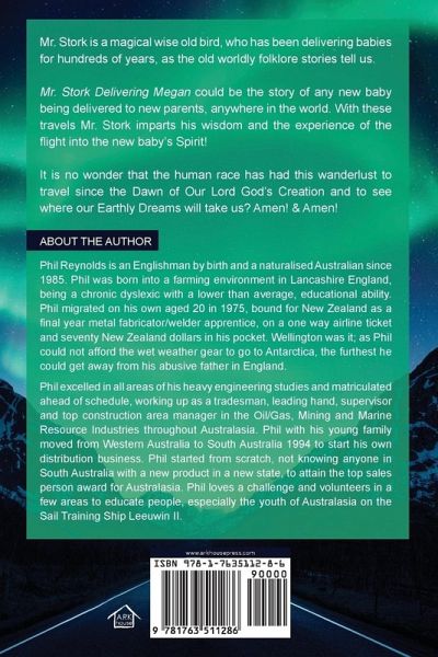Mr. Stork is a magical wise old bird, who has been delivering babies for hundreds of years, as the old worldly folklore stories tell us. Mr. Stork Delivering Megan could be the story of any new baby being delivered to new parents, anywhere in the world. With these travels Mr. Stork imparts his wisdom and the experience of the flight into the new baby's Spirit! It is no wonder that the human race has had this wanderlust to travel since the Dawn of Our Lord God's Creation and to see where our Earthly Dreams will take us? Amen! & Amen!