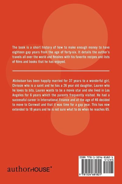 The book is a short history of how to make enough money to have eighteen gap years from the age of forty-six. It details the author’s travels all over the world and finishes with his favorite recipes and lists of films and books that he has enjoyed.