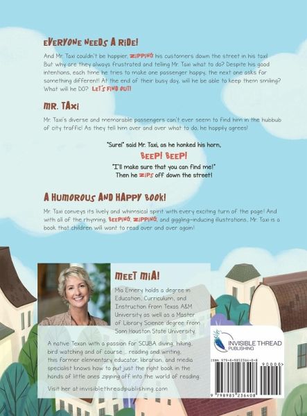 EVERYONE NEEDS A RIDE! And Mr. Taxi couldn't be happier ZIPPING his customers down the street in his taxi! But why are they always telling Mr. Taxi what to do? Despite his good intentions, each time he tries to make one passenger happy, the next one asks for something different! At the end of their busy day, will he be able to keep them smiling? What will he DO? LET'S FIND OUT! Mr. Taxi's diverse and memorable passengers can't ever seem to find him in the hubbub of city traffic! As they tell him over and over what to do, he happily agrees! "Sure!" said Mr. Taxi, as he honked his horn ... BEEP! BEEP! "I'll make sure that you can find me!" Then he ZIPS off down the street! Get your copy today and start having fun! BEEP! BEEP! A HUMOROUS AND HAPPY BOOK! Mr. Taxi conveys its lively and whimsical spirit with every exciting turn of the page! And with all of the rhyming, BEEPING, ZIPPING, and giggle-inducing illustrations, Mr. Taxi is a book that children will want to read over and over again! BE AN EXPLORER! Go on a seek-and-find adventure to search high and low for little hints and clues to discover what his passengers might ask for NEXT! Would you like a tiny clue? (Look closely on the pages where Mr. Taxi picks up his passengers in the city!) Ever changing and fun family read-aloud! Mr. Taxi uses rhyme and rhythm to introduce the concept of COLOR and serves as a tool for making and showcasing relatable connections that inspire friendships, while developing comprehension through nuanced illustrations, diverse, smiling characters, and positive dialogue. Crafted with intention, Mr. Taxi is a lively book for children to engage in independently, as well as one that parents, teachers, and librarians can employ for numerous lessons. Vibrant, colorful and expressive illustrations are sure to keep children captivated! Click "Follow The Author" to read about Mia. From there, visit the Invisible Thread Publishing website to explore the world of Mr. Taxi further and get the inside-scoop on the characters! Click on the "Grown-Ups" page for free printable learning activities! The Fun Doesn't Stop! Have TWICE as much fun Zipping-off with Mr. Taxi by collecting both books! MR. TAXI & MR. TAXI'S WILD RIDE! BEEP! BEEP!