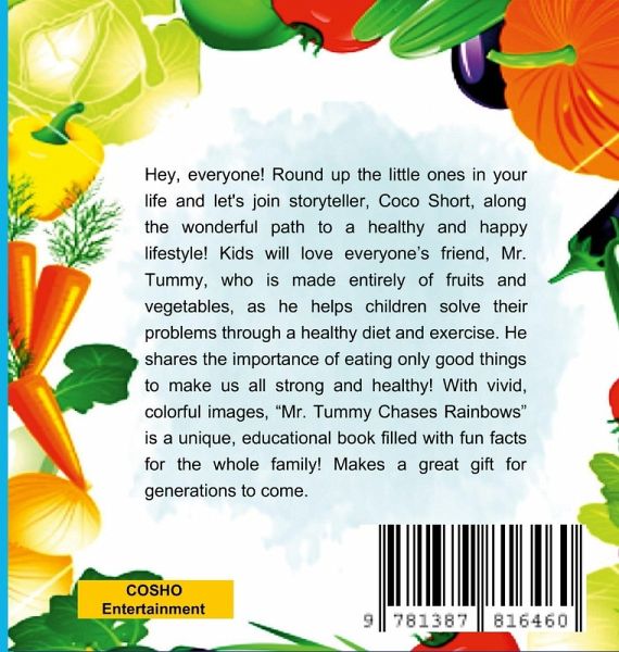 Hey, everyone! Round up the little ones in your life and let's join storyteller, Coco Short, along the wonderful path to a healthy and happy lifestyle! Kids will love, everyone's friend, Mr. Tummy, who is made entirely of fruits and vegetables, as he helps children solve their problems through a healthy diet and exercise. He shares the importance of eating only good things to make us all strong and healthy! With vivid, colorful images, "Mr. Tummy Chases Rainbows" is a unique, educational book filled with fun facts for the whole family! Makes a great gift for generations to come.