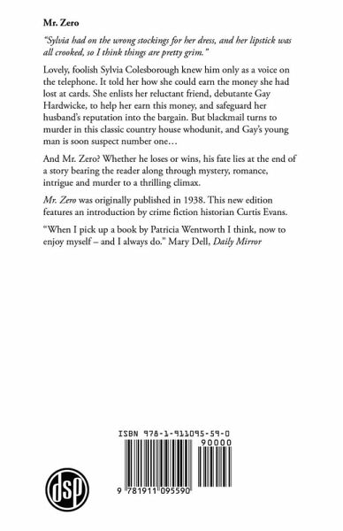 "Sylvia had on the wrong stockings for her dress, and her lipstick was all crooked, so I think things are pretty grim." Lovely, foolish Sylvia Colesborough knew him only as a voice on the telephone. It told her how she could earn the money she had lost at cards. She enlists her reluctant friend, debutante Gay Hardwicke, to help her earn this money, and safeguard her husband's reputation into the bargain. But blackmail turns to murder in this classic country house whodunit, and Gay's young man is soon suspect number one… And Mr. Zero? Whether he loses or wins, his fate lies at the end of a story bearing the reader along through mystery, romance, intrigue and murder to a thrilling climax. Mr. Zero was originally published in 1938. This new edition features an introduction by crime fiction historian Curtis Evans. "When I pick up a book by Patricia Wentworth I think, now to enjoy myself - and I always do." Mary Dell, Daily Mirror