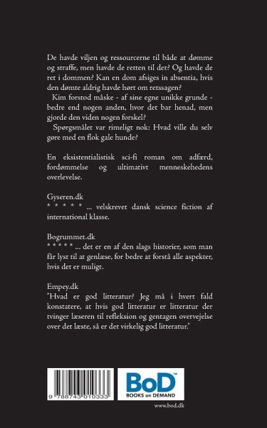 De havde viljen og ressourcerne til både at dømme og straffe, men havde de retten til det? Og havde de ret i dommen? Kan en dom afsiges in absentia, hvis den dømte aldrig havde hørt om retssagen? Kim forstod måske - af sine egne unikke grunde - bedre end nogen anden, hvor det bar henad, men gjorde den viden nogen forskel? Spørgsmålet var rimeligt nok: Hvad ville du selv gøre med en flok gale hunde? En eksistentialistisk sci-fi roman om adfærd, fordømmelse og ultimativt menneskehedens overlevelse. Gyseren.dk * * * * * ... velskrevet dansk science fiction af international klasse. Bogrummet.dk * * * * * ... det er en af den slags historier, som man får lyst til at genlæse, for bedre at forstå alle aspekter, hvis det er muligt. Empey.dk "Hvad er god litteratur? Jeg må i hvert fald konstatere, at hvis god litteratur er litteratur der tvinger læseren til refleksion og gentagen overvejelse over det læste, så er det virkelig god litteratur."