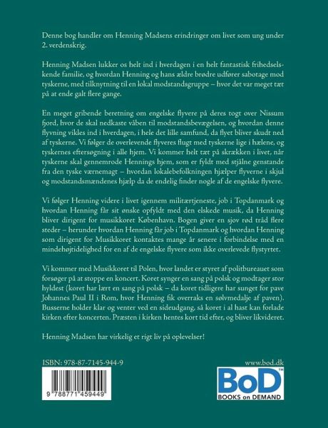 Denne bog handler om Henning Madsens erindringer om livet som ung under 2. verdenskrig. Henning Madsen lukker os helt ind i hverdagen i en helt fantastisk frihedselskende familie, og hvordan Henning og hans ældre brødre udfører sabotage mod tyskerne, med tilknytning til en lokal modstandsgruppe ¿ hvor det var meget tæt på at ende galt flere gange. En meget gribende beretning om engelske flyvere på deres togt over Nissum fjord, hvor de skal nedkaste våben til modstandsbevægelsen, og hvordan denne flyvning vikles ind i hverdagen, i hele det lille samfund, da flyet bliver skudt ned af tyskerne. Vi følger de overlevende flyveres flugt med tyskerne lige i hælene, og tyskernes eftersøgning i alle hjem. Vi kommer helt tæt på skrækken i livet, når tyskerne skal gennemrode Hennings hjem, som er fyldt med stjålne genstande fra den tyske værnemagt ¿ hvordan lokalebefolkningen hjælper flyverne i skjul og modstandsmændenes hjælp da de endelig finder nogle af de engelske flyvere. Vi følger Henning videre i livet igennem militærtjeneste, job i Topdanmark og hvordan Henning får sit ønske opfyldt med den elskede musik, da Henning bliver dirigent for musikkoret København. Bogen giver en sjov rød tråd flere steder ¿ herunder hvordan Henning får job i Topdanmark og hvordan Henning som dirigent for Musikkoret kontaktes mange år senere i forbindelse med en mindehøjtidelighed for en af de engelske flyvere som ikke overlevede flystyrtet. Vi kommer med Musikkoret til Polen, hvor landet er styret af politbureauet som forsøger på at stoppe en koncert. Koret synger en sang på polsk og modtager stor hyldest (koret har lært en sang på polsk ¿ da koret tidligere har sunget for pave Johannes Paul II i Rom, hvor Henning fik overraks en sølvmedalje af paven). Busserne holder klar og venter ved en sideudgang, så koret i al hast kan forlade kirken efter koncerten. Præsten i kirken hentes kort tid efter, og bliver likvideret. Henning Madsen har virkelig et rigt liv på oplevelser!