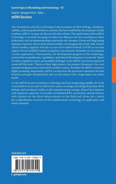 As the mRNA-based vaccination technology has been progressing rapidly, the book is intended to be an end-to-end review series, covering everything from basic RNA biology and preclinical studies to the manufacturing strategy, clinical development and regulatory approval. It provides established RNA researchers and developers with updates on the latest advancements in the field and allows for a quick but comprehensive overview of this transformative technology, its application, and future potential.