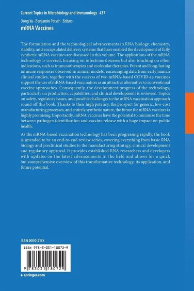 As the mRNA-based vaccination technology has been progressing rapidly, the book is intended to be an end-to-end review series, covering everything from basic RNA biology and preclinical studies to the manufacturing strategy, clinical development and regulatory approval. It provides established RNA researchers and developers with updates on the latest advancements in the field and allows for a quick but comprehensive overview of this transformative technology, its application, and future potential.