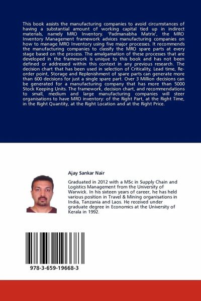 This book assists the manufacturing companies to avoid circumstances of having a substantial amount of working capital tied up in indirect materials, namely MRO Inventory. Padmanabha Matrix , the MRO Inventory Management framework advices manufacturing companies on how to manage MRO Inventory using five major processes. It recommends the manufacturing companies to classify the MRO spare parts at every stage based on the process. The amalgamation of these processes that are developed in the framework is unique to this book and has not been defined or addressed within this context in any previous research. The decision chart that has been used in selection of Criticality, Lead time, Re-order point, Storage and Replenishment of spare parts can generate more than 600 decisions for just a single spare part. Over 3 Million decisions can be generated for a manufacturing company that has more than 5000 Stock Keeping Units. The framework, decision chart, and recommendations to small, medium and large manufacturing companies will steer organisations to have MRO inventory: of the Right Part, at the Right Time, in the Right Quantity, at the Right Location and at the Right Price.