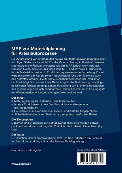 Die Aufarbeitung von Altprodukten hat als profitable Recyclingstrategie einen wichtigen Stellenwert erreicht. Für die Materialplanung in Kreislaufprozessen sind traditionelle Planungskonzepte wie das MRP jedoch nicht gerüstet. Christian Gotzel erweitert das klassische MRP und entwickelt Heuristiken für die Materialdisposition in Produktionssystemen mit Aufarbeitung. Dabei werden sowohl der Fall externer Produktrückführung vom Markt als auch das Auftreten interner Rückflüsse aus Ausbeuteverlusten der Produktion berücksichtigt. Von wesentlicher Bedeutung ist die Absicherung recyclingspezifischer Risiken durch geeignete Festlegung von Sicherheitsbeständen. Im Ergebnis liegen einfach handhabbare Heuristiken vor, deren Lösungsgüte mit Hilfe numerischer Untersuchungen dokumentiert wird.