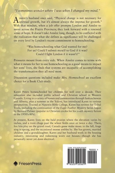 "I sometimes wonder where I was when I changed my mind." Ainslee's husband once said, "Physical change is not necessary for spiritual growth, but it's almost always the impetus for growth." With that mindset, when a job offer prompts Lyndon and Ainslee to move across the Prairie Provinces; they look forward with a renewed sense of hope. It doesn't take Ainslee long, though, to be conflicted with the realization that what she defines as significance will be challenged on every level by Lyndon's recent commitment to homeschooling. "Was homeschooling what God wanted for me? For us? Could I submit myself to God if it was? Could I fight Lyndon if it wasn't?" Pressures mount from every side. When Ainslee comes to terms with what it means for her to use homeschooling as a good means to impact her sons' lives, she finds that systems are incapable of accomplishing the transformation they all need most. Discussion questions included make Mrs. Homeschool an excellent choice for a Book Club study.