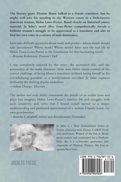 "A captivating biographical novel... with Mrs. Lowe-Porter, Jo Salas has achieved the writing triumph that her never-met but vividly imagined grandmother-in-law hoped to write...a magnificent literary achievement." --BookTrib A fascinating reimagining of the overlooked, complicated life of Thomas Mann's translator, Helen Lowe-Porter The literary giant Thomas Mann balked at a female translator, but he might well owe his standing in the Western canon to a little-known American woman, Helen Lowe-Porter. Based closely on historical source material, Jo Salas's novel Mrs. Lowe-Porter sympathetically reveals a brilliant woman's struggle to be appreciated as a translator and find her voice in a male-dominated culture. Married to the charming classicist Elias Lowe, whom she met and fell in love with while in Munich, the story weaves one woman's journey as her husband Elias's career soars and her translation work earns Mann the Nobel Prize. The novel celebrates Helen Lowe-Porter as she learns to risk stepping out from the long shadow of the dominating men of her life to become a person of letters in her own right.