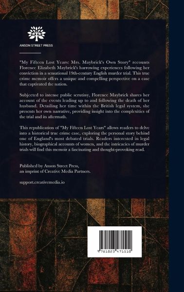 "My Fifteen Lost Years: Mrs. Maybrick's Own Story" recounts Florence Elizabeth Maybrick's harrowing experiences following her conviction in a sensational 19th-century English murder trial. This true crime memoir offers a unique and compelling perspective on a case that captivated the nation. Subjected to intense public scrutiny, Florence Maybrick shares her account of the events leading up to and following the death of her husband. Detailing her time within the British legal system, she presents her own narrative, providing insight into the complexities of the trial and its aftermath. This republication of "My Fifteen Lost Years" allows readers to delve into a historical true crime case, exploring the personal story behind one of England's most debated trials. Readers interested in legal history, biographical accounts of women, and the intricacies of murder trials will find this memoir a fascinating and thought-provoking read. This work has been selected by scholars as being culturally important, and is part of the knowledge base of civilization as we know it. This work is in the public domain in the United States of America, and possibly other nations. Within the United States, you may freely copy and distribute this work, as no entity (individual or corporate) has a copyright on the body of the work. Scholars believe, and we concur, that this work is important enough to be preserved, reproduced, and made generally available to the public. We appreciate your support of the preservation process, and thank you for being an important part of keeping this knowledge alive and relevant.