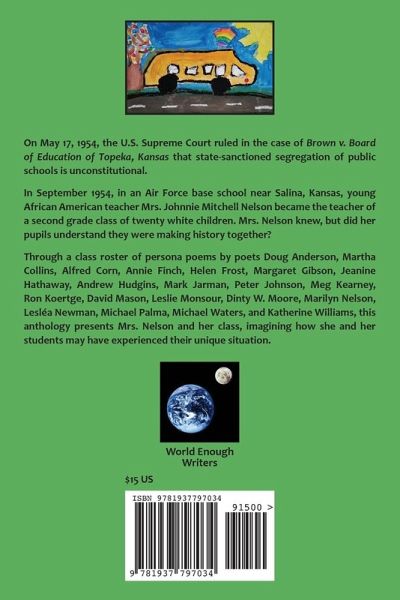 On May 17, 1954, the U.S. Supreme Court ruled in the case of Brown v. Board of Education of Topeka, Kansas that state-sanctioned segregation of public schools is unconstitutional. In September 1954, in an Air Force base school near Salina, Kansas, young African American teacher Mrs. Johnnie Mitchell Nelson became the teacher of a second grade class of twenty white children. Mrs. Nelson knew, but did her pupils understand they were making history together? Through a class roster of persona poems by poets Doug Anderson, Martha Collins, Alfred Corn, Annie Finch, Helen Frost, Margaret Gibson, Jeanine Hathaway, Andrew Hudgins, Mark Jarman, Peter Johnson, Meg Kearney, Ron Koertge, David Mason, Leslie Monsour, Dinty W. Moore, Marilyn Nelson, Lesléa Newman, Michael Palma, Michael Waters, and Katherine Williams, this anthology presents Mrs. Nelson and her class, imagining how she and her students may have experienced their unique situation.