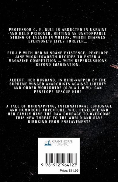 Professor C. E. Gull is abducted in Ukraine and held prisoner, setting an unstoppable string of events in motion, which changes everyone’s lives forever… Fed-up with her mundane existence, Penelope Jane Wigglesworth decides to enter a magazine competition … with repercussions beyond imagination. Albert, her husband, is bird-napped by the Supreme Winged Anarchists against Liberty and Order Worldwide (S.W.A.L.O.W). Can Penelope rescue him? A tale of birdnapping, international espionage and humorous adventure. Will Penelope and her family have the raw courage to overcome this new threat to the world and save birdkind from enslavement?