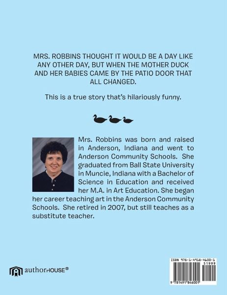 My book is MRS. ROBBINS DUCKY DAY. It has been told to over 1,000 of my students. They wanted me to tell it over, and over,and over again! So I told them I would write a book for them to read. Now they are scattered all over town, and others hve heard it too. They ask,"Is the book done yet?"