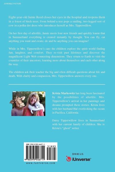 Eight-year-old Jamie Reed closes her eyes in the hospital and reopens them in a forest of birch trees. From behind a tree pops a miniature sort of cow with a small antler at her forehead, who introduces herself as Mrs. Tipperwillow. On that first golden day in the spirit world, Jamie meets four new friends near her own age and learns that in Summerland there are no limits to what is possible. You can fly, eat anything you want (and it will always be good for you) and create, do and be anything you can imagine. In Mrs. Tipperwillow's care, the children discover friendship, fun, comfort and the answers to their most heartfelt questions about life and afterlife.
