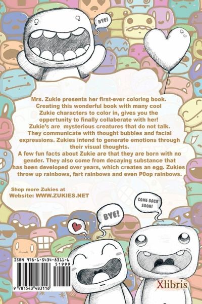 Mrs. Zukie presents her very first coloring book, creating the wonderful book with many cool Zukie characters to color in, gives you the opportunity to finally collaborate with her! Zukie's are mysterious creatures that do not talk. They communicate with thought bubbles and facial expressions. Zukies intend to generate emotions through their visual thoughts. A few fun facts about Zukie are that they are born with no gender. They also come from decaying substance that has been developed over years, which creates an egg. Zukies throw up rainbows, farts rainbows, and even poop rainbows.