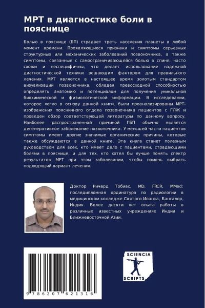 Bol'ü w poqsnice (BP) stradaet tret' naseleniq planety w lüboj moment wremeni. Proqwlqüschiesq priznaki i simptomy ser'eznyh strukturnyh ili mehanicheskih zabolewanij pozwonochnika, a takzhe simptomy, swqzannye s samoogranichiwaüschejsq bol'ü w spine, chasto shozhi i nespecifichny, chto delaet ispol'zowanie nadezhnoj diagnosticheskoj tehniki reshaüschim faktorom dlq prawil'nogo lecheniq. MRT qwlqetsq w nastoqschee wremq zolotym standartom wizualizacii pozwonochnika, obladaq prewoshodnoj sposobnost'ü opredelqt' anatomiü i potencialom dlq polucheniq unikal'noj biohimicheskoj i fiziologicheskoj informacii. V issledowanii, kotoroe leglo w osnowu dannoj knigi, byli proanalizirowany MRT-izobrazheniq poqsnichnogo otdela pozwonochnika pacientow s GLZh i proweden obzor sootwetstwuüschej literatury po dannomu woprosu. Naibolee rasprostranennoj prichinoj GBP obychno qwlqetsq degeneratiwnoe zabolewanie pozwonochnika. U men'shej chasti pacientow simptomy imeüt drugie znachimye organicheskie prichiny, kotorye takzhe obsuzhdaütsq w dannoj knige. Jeta kniga stanet poleznym rukowodstwom dlq wseh, kto imeet delo s pacientami, stradaüschimi bolqmi w poqsnice, i dlq teh, kto hotel by luchshe ponqt' spektr rezul'tatow MRT pri ätom zabolewanii, chtoby pomoch' wybrat' podhodqschij wariant lecheniq.