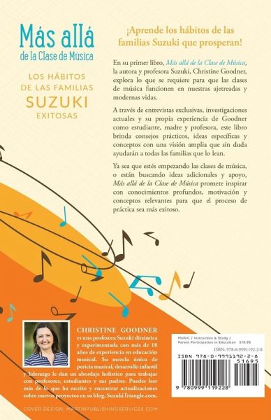 ¡Aprende los hábitos de las familias Suzuki que prosperan! En su primer libro, Más allá de la Clase de Música, la autora y profesora Suzuki, Christine Goodner, explora lo que se requiere para que las clases de música funcionen en nuestras ajetreadas y modernas vidas. A través de entrevistas exclusivas, investigaciones actuales y su propia experiencia de Goodner como estudiante, madre y profesora, este libro brinda consejos prácticos, ideas específicas y conceptos con una visión amplia que sin duda ayudarán a todas las familias que lo lean. Ya sea que estés empezando las clases de música, o están buscando ideas adicionales y apoyo, Más allá de la Clase de Música promete inspirar con conocimientos profundos, motivación y conceptos relevantes para que el proceso de práctica sea más exitoso.