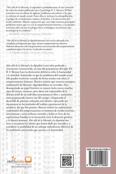 Más allá de la libertad y la dignidad es una obra profunda y ciertamente controvertida, un hito del pensamiento del siglo XX. B. F. Skinner hace su declaración definitiva sobre la humanidad y la sociedad. Insistiendo en que los problemas del mundo actual sólo pueden resolverse tratando de forma mucho más eficaz el comportamiento humano, Skinner sostiene que nuestros conceptos tradicionales de libertad y dignidad deben ser revisados. Han desempeñado un papel histórico en nuestra lucha contra muchos tipos de tiranía, reconoce, pero ahora son responsables de la defensa inútil de un individuo presuntamente libre y autónomo; están perpetuando nuestro uso del castigo y bloqueando el desarrollo de prácticas culturales más eficaces. Apoyando sus argumentos en los resultados del análisis experimental de la conducta, del que fue pionero, Skinner rechaza las explicaciones tradicionales del comportamiento en términos de estados internos, sentimientos y otros atributos mentales y habla en favor de las explicaciones basadas en la interacción entre la dotación genética y la historia personal. Más allá de la libertad y la dignidad nos insta a reexaminar los ideales que hemos dado por sentados y a considerar la posibilidad de un enfoque radicalmente diferente de los problemas existenciales que acucian a la humanidad.