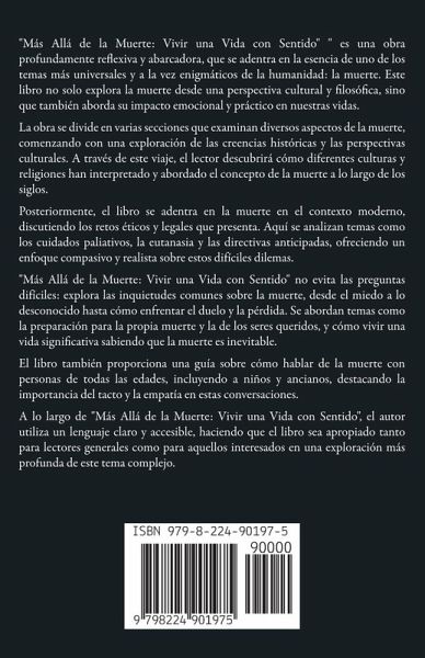 "Más Allá de la Muerte: Vivir una Vida con Sentido" " es una obra profundamente reflexiva y abarcadora, que se adentra en la esencia de uno de los temas más universales y a la vez enigmáticos de la humanidad: la muerte. Este libro no solo explora la muerte desde una perspectiva cultural y filosófica, sino que también aborda su impacto emocional y práctico en nuestras vidas. La obra se divide en varias secciones que examinan diversos aspectos de la muerte, comenzando con una exploración de las creencias históricas y las perspectivas culturales. A través de este viaje, el lector descubrirá cómo diferentes culturas y religiones han interpretado y abordado el concepto de la muerte a lo largo de los siglos. Posteriormente, el libro se adentra en la muerte en el contexto moderno, discutiendo los retos éticos y legales que presenta. Aquí se analizan temas como los cuidados paliativos, la eutanasia y las directivas anticipadas, ofreciendo un enfoque compasivo y realista sobre estos difíciles dilemas. "Más Allá de la Muerte: Vivir una Vida con Sentido" no evita las preguntas difíciles: explora las inquietudes comunes sobre la muerte, desde el miedo a lo desconocido hasta cómo enfrentar el duelo y la pérdida. Se abordan temas como la preparación para la propia muerte y la de los seres queridos, y cómo vivir una vida significativa sabiendo que la muerte es inevitable. El libro también proporciona una guía sobre cómo hablar de la muerte con personas de todas las edades, incluyendo a niños y ancianos, destacando la importancia del tacto y la empatía en estas conversaciones. A lo largo de "Más Allá de la Muerte: Vivir una Vida con Sentido", el autor utiliza un lenguaje claro y accesible, haciendo que el libro sea apropiado tanto para lectores generales como para aquellos interesados en una exploración más profunda de este tema complejo. Con su enfoque integral y su tono reflexivo, este libro es una lectura esencial para cualquier persona que busque comprender la muerte no solo como el final de la vida, sino como una parte integral y enriquecedora de la experiencia humana. "Más Allá de la Muerte" es más que un libro sobre la muerte; es una invitación a valorar la vida y a encontrar consuelo y sabiduría en nuestra mortalidad.