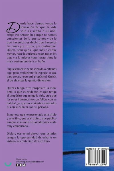 Desde hace tiempo tengo la sensación de que la vida solo es sueño e ilusión, tengo esa sensación porque no somos conscientes de lo que somos y de lo que hacemos, es decir, que hacemos las cosas por rutina, por costumbre. Quiero decir que el que más o el que menos, hace las mismas cosas todos los días y a la misma hora, hasta tiene la mala costumbre de ir al baño. Supuestamente hemos venido o estamos aquí para evolucionar la especie, o sea, para crecer, ¿con qué propósito? Quizás el de alcanzar la quinta dimensión. Quizás tenga otro propósito la vida, pero lo que es evidente, es que tenga el propósito que tenga la vida, creo que los seres humanos no son felices con su hábitat, ya que no se sienten realizados ni con su vida ni con su persona. Es por eso que he presentado este título y este libro, que es el quinto que público aunque el mundo de las editoriales está muy complicado. Ojalá y ese es mi deseo, que ustedes tengan la oportunidad de echarle un vistazo, al contenido de este libro.