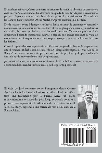 En este libro reflexivo, Castro comparte una riqueza de sabiduría obtenida de una carrera en la Fuerza Aérea de Estados Unidos y una búsqueda de toda la vida para el crecimiento personal. Explora el camino hacia la excelencia personal y profesional con "Más Allá de los Rangos: Las Notas de un Oficial Mesteño Que No Enseñan en la Escuela". Desde lecciones sobre liderazgo y resiliencia hasta historias de crecimiento personal y momentos de autodescubrimiento, este libro ofrece un plan para superar algunos desafíos de la vida, la carrera profesional y el desarrollo personal. Ya seas un profesional de experiencia buscando perspectivas nuevas o alguien que apenas comienza su viaje de crecimiento, este libro proporciona consejos prácticos que resuenan con lectores de todos los ámbitos. Castro ha aprovechado su experiencia en diferentes campos de la Fuerza Aérea para crear este libro tan identificable como esclarecedor. A lo largo de las páginas de "Más Allá de los Rangos", encontrarás orientación práctica, anécdotas inspiradoras y el tipo de sabiduría que solo puede provenir de una vida de aprendizaje. ¡Acompaña al autor, un soñador convertido en oficial de la Fuerza Aérea, y aprovecha la oportunidad de encender tus búsquedas y desbloquear tu potencial!