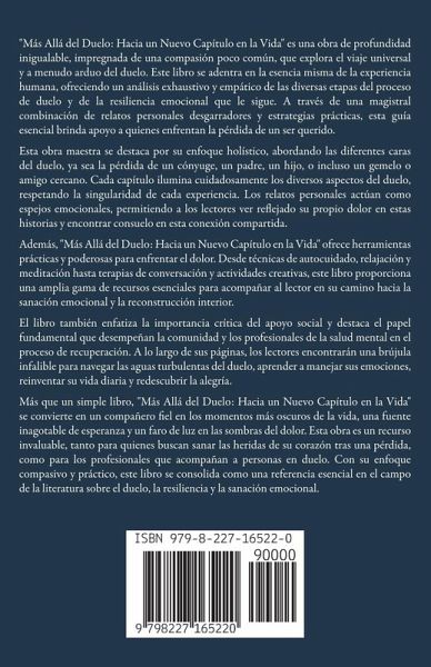 "Más Allá del Duelo: Hacia un Nuevo Capítulo en la Vida" es una obra de profundidad inigualable, impregnada de una compasión poco común, que explora el viaje universal y a menudo arduo del duelo. Este libro se adentra en la esencia misma de la experiencia humana, ofreciendo un análisis exhaustivo y empático de las diversas etapas del proceso de duelo y de la resiliencia emocional que le sigue. A través de una magistral combinación de relatos personales desgarradores y estrategias prácticas, esta guía esencial brinda apoyo a quienes enfrentan la pérdida de un ser querido. Esta obra maestra se destaca por su enfoque holístico, abordando las diferentes caras del duelo, ya sea la pérdida de un cónyuge, un padre, un hijo, o incluso un gemelo o amigo cercano. Cada capítulo ilumina cuidadosamente los diversos aspectos del duelo, respetando la singularidad de cada experiencia. Los relatos personales actúan como espejos emocionales, permitiendo a los lectores ver reflejado su propio dolor en estas historias y encontrar consuelo en esta conexión compartida. Además, "Más Allá del Duelo: Hacia un Nuevo Capítulo en la Vida" ofrece herramientas prácticas y poderosas para enfrentar el dolor. Desde técnicas de autocuidado, relajación y meditación hasta terapias de conversación y actividades creativas, este libro proporciona una amplia gama de recursos esenciales para acompañar al lector en su camino hacia la sanación emocional y la reconstrucción interior. El libro también enfatiza la importancia crítica del apoyo social y destaca el papel fundamental que desempeñan la comunidad y los profesionales de la salud mental en el proceso de recuperación. A lo largo de sus páginas, los lectores encontrarán una brújula infalible para navegar las aguas turbulentas del duelo, aprender a manejar sus emociones, reinventar su vida diaria y redescubrir la alegría. Más que un simple libro, "Más Allá del Duelo: Hacia un Nuevo Capítulo en la Vida" se convierte en un compañero fiel en los momentos más oscuros de la vida, una fuente inagotable de esperanza y un faro de luz en las sombras del dolor. Esta obra es un recurso invaluable, tanto para quienes buscan sanar las heridas de su corazón tras una pérdida, como para los profesionales que acompañan a personas en duelo. Con su enfoque compasivo y práctico, este libro se consolida como una referencia esencial en el campo de la literatura sobre el duelo, la resiliencia y la sanación emocional.
