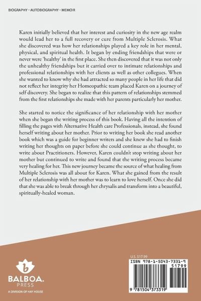 Karen initially believed that her interest and curiosity in the new age realm would lead her to a full recovery or cure from Multiple Sclerosis. What she discovered was how her relationships played a key role in her mental, physical, and spiritual health. It began by ending friendships that were or never were ‘healthy’ in the first place. She then discovered that it was not only the unhealthy friendships but it carried over to intimate relationships and professional relationships with her clients as well as other collegues. When she wanted to know why she had attracted so many people in her life that did not reflect her integrity her Homeopathic team placed Karen on a journey of self discovery. She began to realize that this pattern of relationships stemmed from the first relationships she made with her parents particularly her mother. She started to notice the significance of her relationship with her mother when she began the writing process of this book. Having all the intention of filling the pages with Alternative Health care Professionals, instead, she found herself writing about her mother. Prior to writing her book she read another book which was a guide for beginner writers and she knew she had to finish writing her thoughts on paper before she could continue as she thought, to write about Practitioners. However, Karen couldn’t stop writing about her mother but continued to write and found that the writing process became very healing for her. This new journey became the source of what healing from Multiple Sclerosis was all about for Karen. What she gained from the result of her relationship with her mother was to learn to love herself. Once she did that she was able to break through her chrysalis and transform into a beautiful, spiritually-healed woman.
