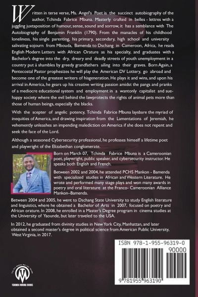 Born on March 07, Tchinda Fabrice. Mbuna is a Cameroonian poet, playwright, public speaker, and cybersecurity instructor. He speaks both English and French. Between 2002 and 2004, he attended PCHS Mankon-Bamenda with specialized studies in African and Western Literature. He wrote and performed many stage plays and won many poetry and oral literature awards at the Franco-Cameroonian Alliance Mankon–Bamenda. Between 2004 and 2005, he went to Dschang State University to study English literature and linguistics, where he obtained a Bachelor of Arts in 2007, focused on poetry and African orature. In 2008, he enrolled in a master's degree program in cinema studies at the University of Yaoundé 1 but later traveled to the USA. In 2012, he graduated from divinity studies in New York City, Manhattan, and later obtained a second master's degree in political science from American Public University, West Virginia, in 2017.