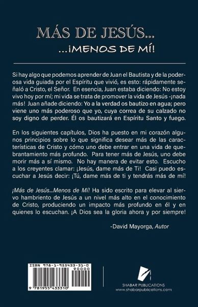 Si hay algo que podemos aprender de Juan el Bautista y de la poderosa vida guiada por el Espíritu que vivió, es esto: rápidamente señaló a Cristo, el Señor. En esencia, Juan estaba diciendo: No estoy vivo hoy por mí; mi vida se trata de promover la vida de Jesús -¡nada más! Juan añade diciendo: Yo a la verdad os bautizo en agua; pero viene uno más poderoso que yo, cuya correa de su calzado no soy digno de perder. Él os bautizará en Espíritu Santo y fuego. En los siguientes capítulos, Dios ha puesto en mi corazón algunos principios sobre lo que significa desear más de las características de Cristo y cómo uno debe entrar en una vida de quebrantamiento más profundo. Para tener más de Jesús, uno debe morir más a sí mismo. No hay manera de evitar esto. Escucho a los creyentes clamar: ¡Jesús, dame más de Ti! Casi puedo escuchar a Jesús decir: ¡Tú, dame más de ti y tendrás más de mí! ¡Más de Jesús, menos de mí! Ha sido escrito para elevar al siervo hambriento de Jesús a un nivel más alto en el conocimiento de Cristo, produciendo un impacto más profundo en él y en quienes lo escuchan. ¡A Dios sea la gloria ahora y por siempre!