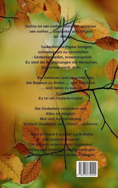 Nichts ist wie vorher und doch genauso wie vorher - Geplänkel und Allüren im Alltag!Gedanken zu Papier bringen, schreiben um zu verarbeiten - Gedanken teilen, erwartungsvoll.Es sind die Begegnungen mit Menschen. Sie formen mich, dich. Sie verletzen und umarmen uns. Die Balance zu finden - sich schützen - sich fallen zu lassen - zu lieben. Es ist ein Gedankenspiel.Die Gedanken verändern uns.Alles ist möglich.Mut und Aufmunterung.Einfach Geplänkel und Allüren - vielleicht.Dies ist Band 5 aus der Lyrik-Reihe "MS-Gedankenspiele".Die Autorin unterstreicht Geplänkel, Allüren und Gedichte mit Zeichnungen und eigenen mutmachenden Collagen.