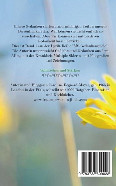 Unsere Gedanken stellen einen mächtigen Teil in unserer Persönlichkeit dar. Wir können sie nicht einfach so ausschalten. Aber wir können viel mit positiven Gedankenflüssen bewirken. Dies ist Band 1 aus der Lyrik-Reihe "MS-Gedankenspiele".Die Autorin unterstreicht Gedichte und Gedanken aus dem Alltag mit der Krankheit Multiple Sklerose mit Fotografien und Zeichnungen.Schwächen und Stärken