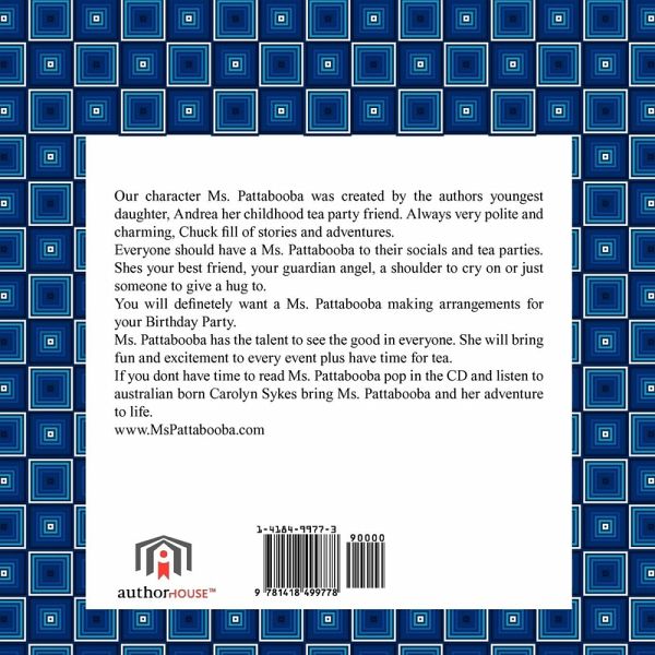 Our character Ms. Pattabooba was created by the authors youngest daughter, Andrea her childhood tea party friend. Always very polite and charming, Chuck fill of stories and adventures. Everyone should have a Ms. Pattabooba to their socials and tea parties. Shes your best friend, your guardian angel, a shoulder to cry on or just someone to give a hug to. You will definetely want a Ms. Pattabooba making arrangements for your Birthday Party. Ms. Pattabooba has the talent to see the good in everyone. She will bring fun and excitement to every event plus have time for tea. If you dont have time to read Ms. Pattabooba pop in the CD and listen to australian born Carolyn Sykes bring Ms. Pattabooba and her adventure to life. www.MsPattabooba.com