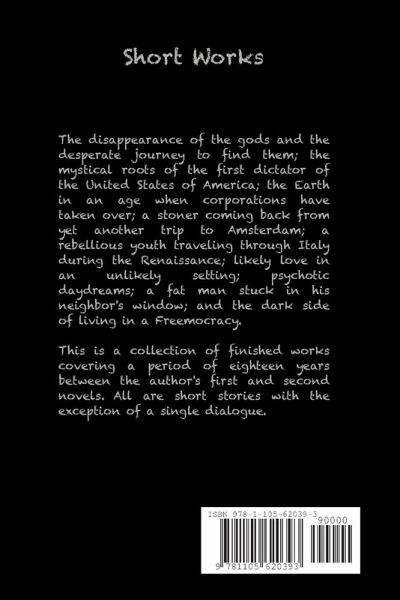 A collection of short stories covering over a decade: the death of the gods; life in a conservative, American family; the Earth in an age when corporations have taken over; a stoner coming back from yet another trip to Amsterdam; a rebellious youth traveling through Italy during the Renaissance; likely love in an unlikely setting; psychotic daydreams; a fat man stuck in his neighbor's window; and the dark side of living in a Freemocracy.
