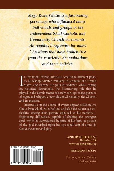 In this book, Bishop Theriault recalls the different phases of Bishop Vilatte's ministry in Canada, the United States, and Europe. He puts in evidence, while leaning on historical documents, the determining role that he played in the development of a new concept of the purpose of organized religion, a new idea of Christianity, the Church, and its mission. Intermixed in the course of events appear collaborative forces from which he benefited, and also the numerous difficulties arising from powers opposed to his ministry. Frightening difficulties, capable of shaking the strongest soul, which he surmounted because of his faith, in pursuit of the goal inscribed upon his episcopal Coat of Arms: To God alone honor and glory.