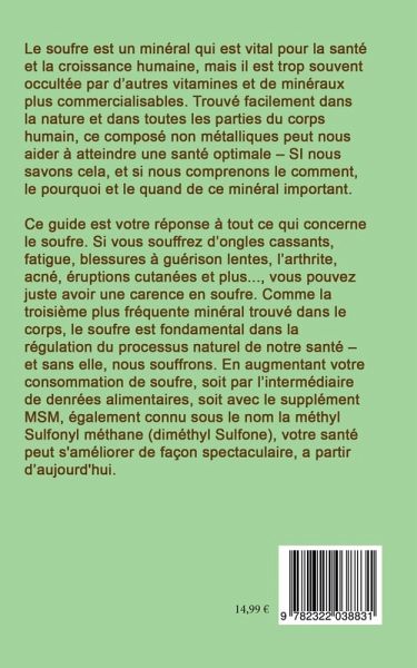 Ce guide est votre réponse à tout ce qui concerne le soufre. Si vous souffrez d'ongles cassants, fatigue, blessures à guérison lentes, l'arthrite, acné, éruptions cutanées et plus..., vous pouvez juste avoir une carence en soufre. Comme la troisième plus fréquente minéral trouvé dans le corps, le soufre est fondamental dans la régulation du processus naturel de notre santé - et sans elle, nous souffrons. En augmentant votre consommation de soufre, soit par l'intermédiaire de denrées alimentaires, soit avec le supplément MSM, également connu sous le nom la méthyl Sulfonyl méthane (diméthyl Sulfone), votre santé peut s'améliorer de façon spectaculaire, a partir d'aujourd'hui.