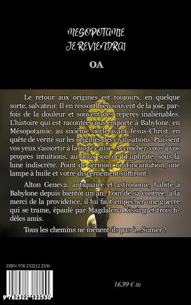 Le retour aux origines est toujours, en quelque sorte, salvateur. Il en ressort bien souvent de la joie, parfois de la douleur et souvent des repères inaliénables. L'histoire qui est racontée vous emporte à Babylone, en Mésopotamie, au sixième siècle avant Jésus-Christ, en quête de vérité sur les origines des civilisations. Puissent vos yeux s'assortir à la juste cause. Accrochez-vous à vos propres intuitions, au doux son de l'Euphrate, sous la lune indiscrète. Point de sermon, ni d'incantation, une lampe à huile et votre discernement suffiront.