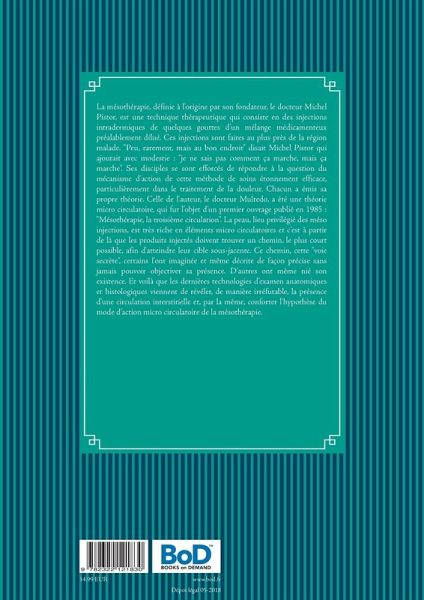 La mésothérapie, définie à l'origine par son fondateur, le docteur Michel Pistor, est une technique thérapeutique qui consiste en des injections intradermiques de quelques gouttes d'un mélange médicamenteux préalablement dilué. Ces injections sont faites au plus près de la région malade. "Peu, rarement, mais au bon endroit" disait Michel Pistor qui ajoutait avec modestie : "je ne sais pas comment ça marche, mais ça marche". Ses disciples se sont efforcés de répondre à la question du mécanisme d'action de cette méthode de soins étonnement efficace, particulièrement dans le traitement de la douleur. Chacun a émis sa propre théorie. Celle de l'auteur, le docteur Multedo, a été une théorie micro circulatoire, qui fut l'objet d'un premier ouvrage publié en 1985 : "Mésothérapie, la troisième circulation". La peau, lieu privilégié des méso injections, est très riche en éléments micro circulatoires et c'est à partir de là que les produits injectés doivent trouver un chemin, le plus courtpossible, afin d'atteindre leur cible sous-jacente. Ce chemin, cette "voie secrète", certains l'ont imaginée et même décrite de façon précise sans jamais pouvoir objectiver sa présence. D'autres ont même nié son existence. Et voilà que les dernières technologies d'examen anatomiques et histologiques viennent de révéler, de manière irréfutable, la présence d'une circulation interstitielle et, par la même, conforter l'hypothèse du mode d'action micro circulatoire de la mésothérapie.