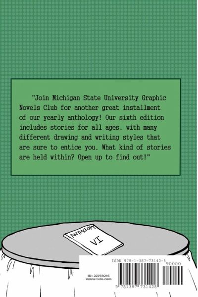 Join Michigan State University Graphic Novels Club for another great installment of our yearly anthology! Our sixth edition includes stories for all ages, with many different drawing and writing styles that are sure to entice you. What kind of stories are held within? Open up to find out!