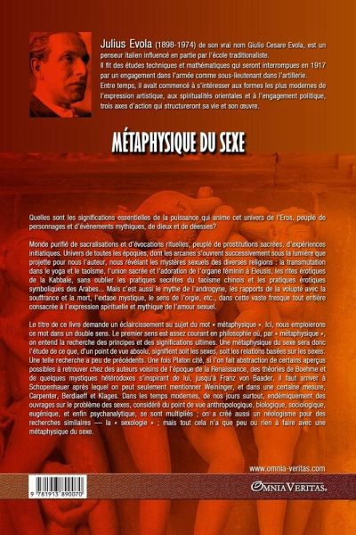 Quelles sont les significations essentielles de la puissance qui anime cet univers de l'Eros, peuplé de personnages et d'événements mythiques, de dieux et de déesses? Monde purifié de sacralisations et d'évocations rituelles, peuplé de prostitutions sacrées, d'expériences initiatiques. Univers de toutes les époques, dont les arcanes s'ouvrent successivement sous la lumière que projette pour nous l'auteur, nous révélant les mystères sexuels des diverses religions : la transmutation dans le yoga et le taoïsme, l'union sacrée et l'adoration de l'organe féminin à Eleusis, les rites érotiques de la Kabbale, sans oublier les pratiques secrètes du taoïsme chinois et les pratiques érotiques symboliques des Arabes... Mais c'est aussi le mythe de l'androgyne, les rapports de la volupté avec la souffrance et la mort, l'extase mystique, le sens de l'orgie, etc., dans cette vaste fresque tout entière consacrée à l'expression spirituelle et mythique de l'amour sexuel. Le titre de ce livre demande un éclaircissement au sujet du mot métaphysique . Ici, nous emploierons ce mot dans un double sens. Le premier sens est assez courant en philosophie où, par métaphysique , on entend la recherche des principes et des significations ultimes. Une métaphysique du sexe sera donc l'étude de ce que, d'un point de vue absolu, signifient soit les sexes, soit les relations basées sur les sexes. Une telle recherche a peu de précédents. Une fois Platon cité, si l'on fait abstraction de certains aperçus possibles à retrouver chez des auteurs voisins de l'époque de la Renaissance, des théories de Boehme et de quelques mystiques hétérodoxes s'inspirant de lui, jusqu'à Franz von Baader, il faut arriver à Schopenhauer après lequel on peut seulement mentionner Weininger, et dans une certaine mesure, Carpenter, Berdiaeff et Klages. Dans les temps modernes, de nos jours surtout, endémiquement des ouvrages sur le problème des sexes, considéré du point de vue anthropologique, biologique, sociologique, eugénique, et enfin psychanalytique, se sont multipliés ; on a créé aussi un néologisme pour des recherches similaires - la sexologie ; mais tout cela n'a que peu ou rien à faire avec une métaphysique du sexe.