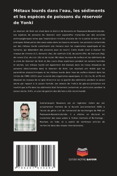 Le réservoir de Yonki est situé dans le district de Kainantu en Papouasie-Nouvelle-Guinée. Les espèces de poissons du réservoir sont aujourd'hui menacées par des activités anthropogéniques telles que l'exploitation minière alluviale de l'or à petite échelle et les pratiques d'évacuation des eaux usées dans les bassins versants. Les poissons contaminés par des métaux lourds constituent une menace pour les organismes aquatiques et les humains, qui dépendent des poissons pour se nourrir. Cette étude visait à évaluer les niveaux de chrome (Cr), d'arsenic (As), de cadmium (Cd), de plomb (Pb), de mercure (Hg), de cuivre (Cu), de zinc (Zn) et de nickel (Ni) dans les eaux de surface et les sédiments de la zone du réservoir de Yonki et des cours d'eau supérieurs pendant les saisons humides et sèches. Les métaux lourds ont également été évalués dans les tissus d'espèces de poissons sélectionnées dans le réservoir de Yonki. Les résultats ont révélé que les paramètres physiochimiques et les métaux lourds dans l'eau de surface étaient dans les limites de l'OMS (2011) pour la survie des organismes aquatiques. Cr, Cd, Cu, Ni, et Pb ont dépassé les niveaux de la ligne directrice sur la qualité des sédiments pendant la saison sèche par rapport à la saison humide. Les valeurs de l'indice de géo-accumulation ont montré que le Pb dans les sédiments était fortement contaminé, en particulier pendant la saison sèche. Enfin, un plan de gestion des déchets a été recommandé.