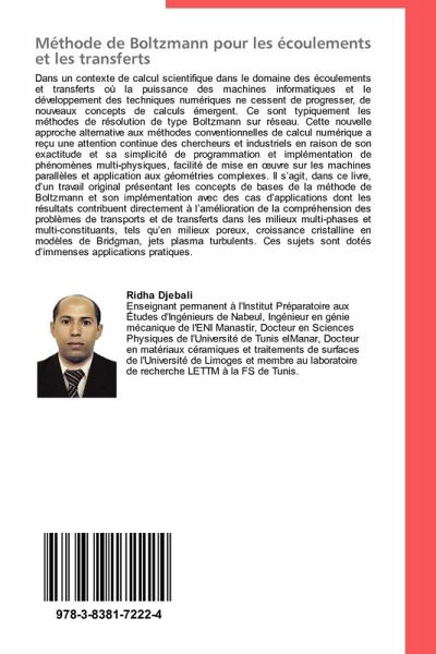 Dans un contexte de calcul scientifique dans le domaine des écoulements et transferts où la puissance des machines informatiques et le développement des techniques numériques ne cessent de progresser, de nouveaux concepts de calculs émergent. Ce sont typiquement les méthodes de résolution de type Boltzmann sur réseau. Cette nouvelle approche alternative aux méthodes conventionnelles de calcul numérique a reçu une attention continue des chercheurs et industriels en raison de son exactitude et sa simplicité de programmation et implémentation de phénomènes multi-physiques, facilité de mise en uvre sur les machines parallèles et application aux géométries complexes. Il s agit, dans ce livre, d un travail original présentant les concepts de bases de la méthode de Boltzmann et son implémentation avec des cas d applications dont les résultats contribuent directement à l amélioration de la compréhension des problèmes de transports et de transferts dans les milieux multi-phases et multi-constituants, tels qu en milieux poreux, croissance cristalline en modèles de Bridgman, jets plasma turbulents. Ces sujets sont dotés d immenses applications pratiques.