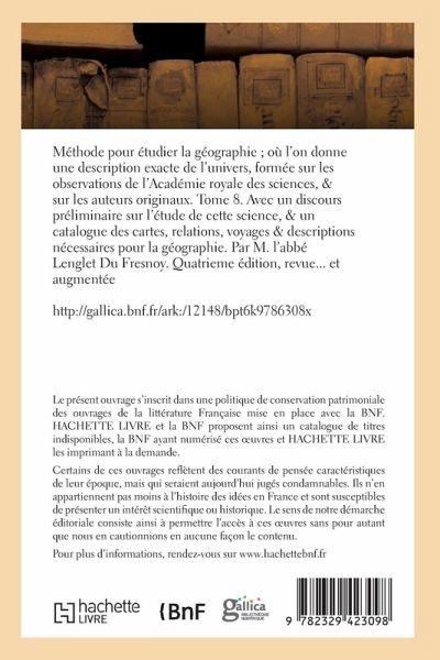 Méthode pour étudier la géographie; où l'on donne une description exacte de l'univers, formée sur les observations de l'Académie royale des sciences, & sur les auteurs originaux. Tome 8 / . Avec un discours préliminaire sur l'étude de cette science, & un catalogue des cartes, relations, voyages & descriptions nécessaires pour la géographie. Par M. l'abbé Lenglet Du Fresnoy. Quatrieme édition, revue... et augmentée Date de l'édition originale: 1768 Le présent ouvrage s'inscrit dans une politique de conservation patrimoniale des ouvrages de la littérature Française mise en place avec la BNF. HACHETTE LIVRE et la BNF proposent ainsi un catalogue de titres indisponibles, la BNF ayant numérisé ces oeuvres et HACHETTE LIVRE les imprimant à la demande. Certains de ces ouvrages reflètent des courants de pensée caractéristiques de leur époque, mais qui seraient aujourd'hui jugés condamnables. Ils n'en appartiennent pas moins à l'histoire des idées en France et sont susceptibles de présenter un intérêt scientifique ou historique. Le sens de notre démarche éditoriale consiste ainsi à permettre l'accès à ces oeuvres sans pour autant que nous en cautionnions en aucune façon le contenu. Pour plus d'informations, rendez-vous sur www.hachettebnf.fr