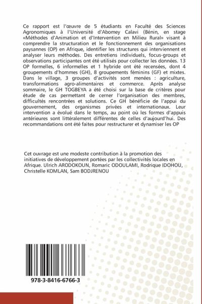 Ce rapport est l'oeuvre de 5 étudiants en Faculté des Sciences Agronomiques à l'Université d'Abomey Calavi (Bénin, en stage «Méthodes d'Animation et d'Intervention en Milieu Rural» visant à comprendre la structuration et le fonctionnement des organisations paysannes (OP) en Afrique, identifier les structures qui interviennent et analyser leurs méthodes. Des entretiens individuels, focus-groups et observations participantes ont été utilisés pour collecter les données. 13 OP formelles, 6 informelles et 1 hybride ont été recensées, dont 4 groupements d'hommes (GH), 8 groupements féminins (GF) et mixtes. Dans le village, 3 groupes d'activités sont menées : agriculture, transformations agro-alimentaires et commerce. Après analyse sommaire, le GH TOGBEYA a été choisi sur la base de critères pour étude de cas permettant de cerner l'organisation des membres, difficultés rencontrées et solutions. Ce GH bénéficie de l'appui du gouvernement, des organismes privées et internationaux. Leur intervention a évolué dans le temps, au point où les formes d'appuis antérieures sont littéralement différentes de celles d'aujourd'hui. Des recommandations ont été faites pour restructurer et dynamiser les OP