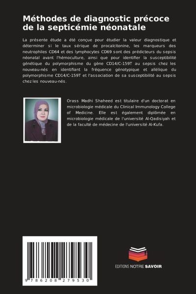 La présente étude a été conçue pour étudier la valeur diagnostique et déterminer si le taux sérique de procalcitonine, les marqueurs des neutrophiles CD64 et des lymphocytes CD69 sont des prédicteurs du sepsis néonatal avant l'hémoculture, ainsi que pour identifier la susceptibilité génétique du polymorphisme du gène CD14/C-159T au sepsis chez les nouveau-nés en identifiant la fréquence génotypique et allélique du polymorphisme CD14/C-159T et l'association de sa susceptibilité au sepsis chez les nouveau-nés.