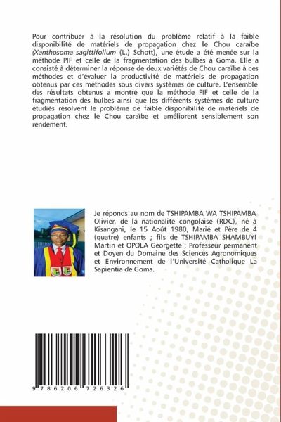 Pour contribuer à la résolution du problème relatif à la faible disponibilité de matériels de propagation chez le Chou caraïbe (Xanthosoma sagittifolium (L.) Schott), une étude a été menée sur la méthode PIF et celle de la fragmentation des bulbes à Goma. Elle a consisté à déterminer la réponse de deux variétés de Chou caraïbe à ces méthodes et d'évaluer la productivité de matériels de propagation obtenus par ces méthodes sous divers systèmes de culture. L'ensemble des résultats obtenus a montré que la méthode PIF et celle de la fragmentation des bulbes ainsi que les différents systèmes de culture étudiés résolvent le problème de faible disponibilité de matériels de propagation chez le Chou caraïbe et améliorent sensiblement son rendement.