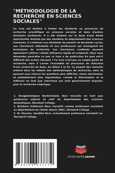 Ce livre est destiné à former les étudiants au processus de recherche scientifique en sciences sociales et dans d'autres domaines pertinents. Il a été élaboré sur la base d'une étude approfondie réalisée par des membres du département des sciences humaines. Il s'adresse aux étudiants de premier et deuxième cycles, aux chercheurs débutants et aux professeurs qui enseignent les techniques de recherche. Les chercheurs confirmés peuvent également l'utiliser comme référence rapide et compacte. Vous vous demandez peut-être ce que ce livre a de particulier. En quoi est-il différent des autres manuels ? Ce livre n'est pas un simple guide de recherche, mais il couvre l'ensemble du processus de rédaction d'une recherche de base, du début à la fin. La plupart des manuels entrent dans les détails des méthodologies de recherche, mais ils passent sous silence les questions plus difficiles, moins structurées et probablement plus importantes, comme la théorisation et la réflexion en tant que chercheur, qui sont généralement requises pour la recherche empirique.