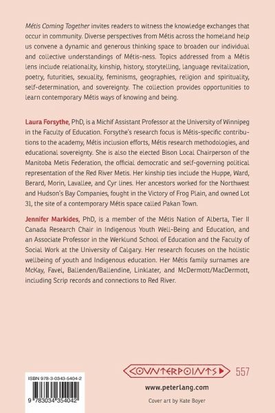 Chelsea Gabel: Foreword - Jennifer Markides/Laura Forsythe: Introduction: Multifaceted Métis: Unavoidable Considerations Around Our Complex Identities - Laura Forsythe/Lucy Delgado: The Reason We Gather: Métis- Specific Spaces - Red River Readers: Red River Readers in Multivocal Flux: Across, Between, and Beyond Traditional Disciplinary Approaches to Métis Studies - Shannon Leddy: The Power of Dancing in Two Worlds: Finding a Fit for Métis Identities in Academia - Kurtis Boyer/Paul Simard Smith: The Métis Nation, Epistemic Injustice, and Self- Indigenization - Chantal Fiola: Returning to Ceremony: A Métis Spiritual Resurgence - Kisha Supernant/Emily Haines/Solène Mallet Gauthier/Maria Nelson/Eric Tebby/William T. D. Wadsworth/Dawn Wambold: Archaeology with Our Ancestors: The Exploring Métis Identity Through Archaeology (EMITA) Project - Robert L. A. Hancock: On Being Elsewhere to Stay: Reflections on Métis Responsibilities Living in the Homelands of Other People - Heather Foulds/Jamie LaFleur/Leah Ferguson: "It's Very Different Walking in Two Worlds as a Métis Person": Identity, Community, Culture and Connections as Determinants of the Health and Wellbeing of Métis Peoples - Laura Forsythe: The Grandmothers of the Prairies to Woodlands Indigenous Language Revitalization Circle - Suzanne M. Steele/with an introduction by Nicole Stonyk: Li Keur, Riel's Heart of the North, an Artistic Narration of Métis History through Peoplehood: Addressing Métis (mis)Recognition and Recentering Métis Women - Yvonne Poitras Pratt/Billie- Jo Grant: Métis Arts as Education: Visual Storytelling, and More, in Alberta - Angie Tucker: Raindrops, Fiddles, and Tall Tales: Navigating Our Diversity Through Storytelling - Lucy Delgado: Learning to Listen Closely: The Listening Guide and "I Poems" in Métis Research Methodologies - Michelle Porter: I Could Turn into a River When I Was a Girl: Crooked Methodologies and the Gathering Research Framework - Angie Tucker/KD King (Sangria Jiggz)/Tanya Ball/Paul L. Gareau: Storying Métis Sexualities: Métis Confessions: Our First Time-Red River Edition.