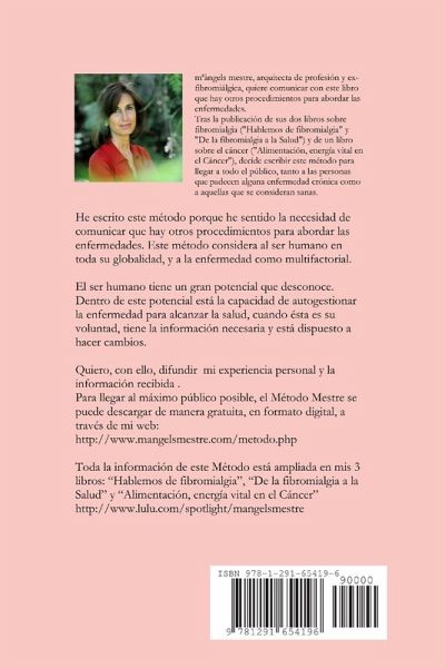 He escrito este método porque he sentido la necesidad de comunicar que hay otros procedimientos para abordar las enfermedades. Este método considera al ser humano en toda su globalidad, y a la enfermedad como multifactorial. El ser humano tiene un gran potencial que desconoce. Dentro de este potencial está la capacidad de autogestionar su enfermedad para alcanzar la salud, cuando ésta es su voluntad, tiene la información necesaria y está dispuesto a hacer cambios. Quiero, con ello, difundir mi experiencia personal y la información recibida . Para llegar al máximo público posible, el Método Mestre se puede descargar de manera gratuita, en formato digital, a través de mi web: http://www.mangelsmestre.com/metodo.php Toda la información del Método Mestre está ampliada en los 3 libros: "Hablemos de fibromialgia", "De la fibromialgia a la Salud" y "Alimentación, energía vital en el Cáncer" http://www.lulu.com/spotlight/mangelsmestre